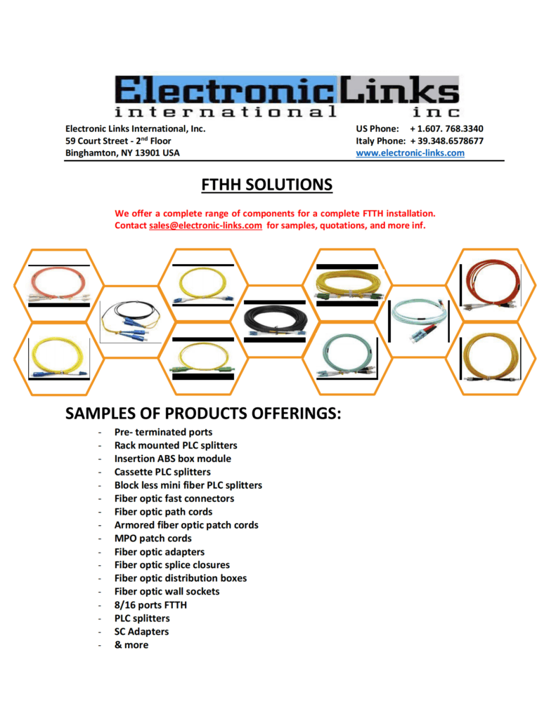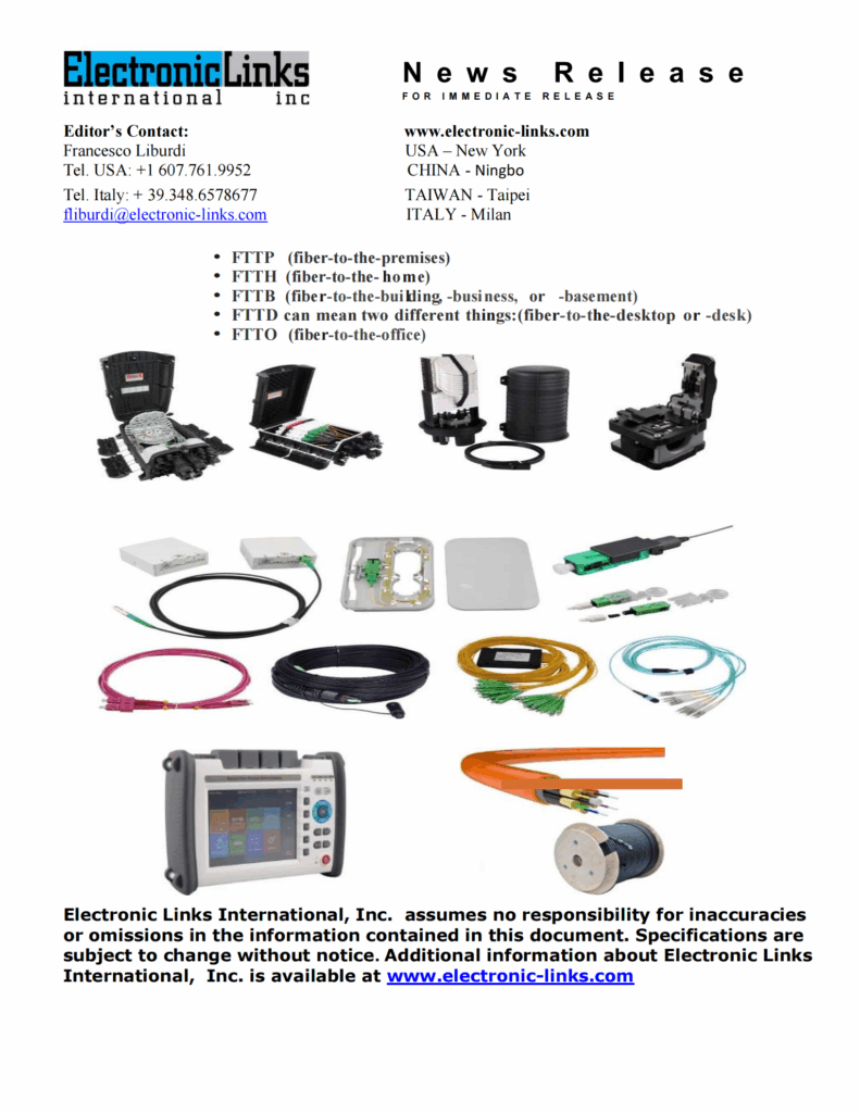Electronic Links International, Inc., with its headquarters in the US and a branch in Italy has reached an agreement with Bwinners, with headquarters in China, whereby ELII will be representing and distributing the FTTH products produced by Bwinners in the following territories: US, Canada, Mexico, and Europe